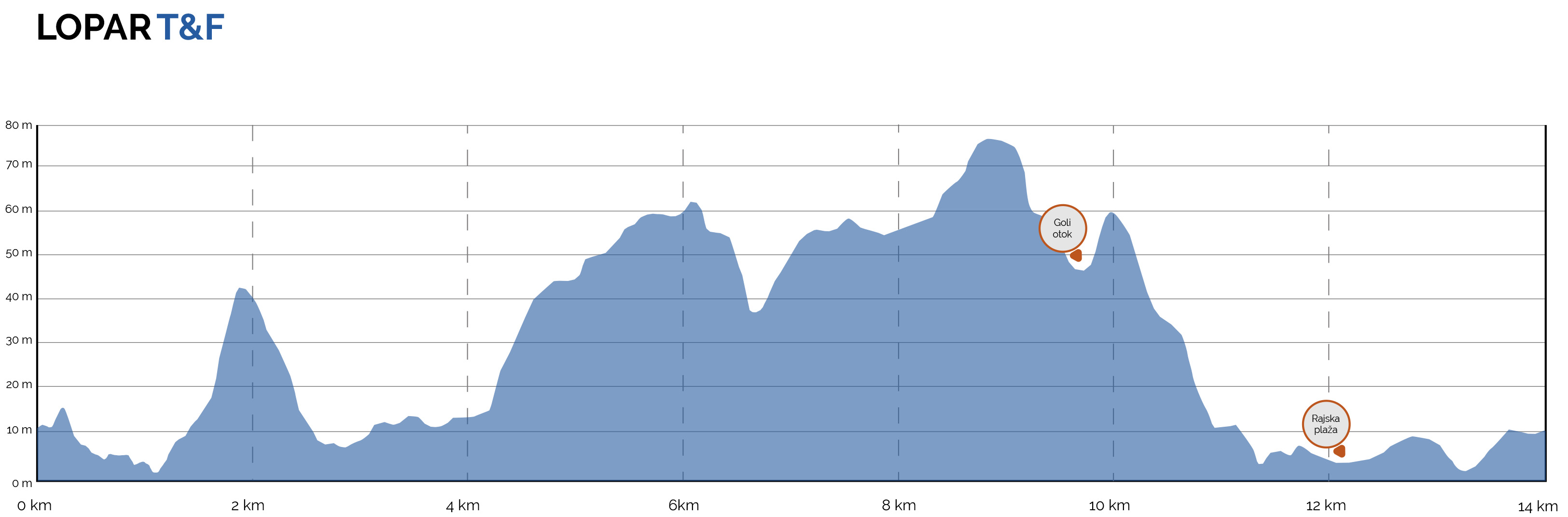 Vožnja namijenjena cijeloj obitelji kreće iz Suhe Punte u smjeru sjevera prema poluotoku Kalifrontu. Cijelim putem staza ide dobro utabanim makadamom i puteljcima kroz netaknutu prirodu, pored brojnih prirodnih šljunčanih i kamenih uvala, sve u dubokom hladu crnogorične šume. Iako kratka, ova ruta od 22 km ima dovoljno sadržaja da na njoj možete provesti cijeli dan otkrivajući sve čari zapadnog dijela otoka, odmoriti se i okupati u uvali koja vam se svidi te se nakon toga vratiti na start rute u Suhu Puntu.
