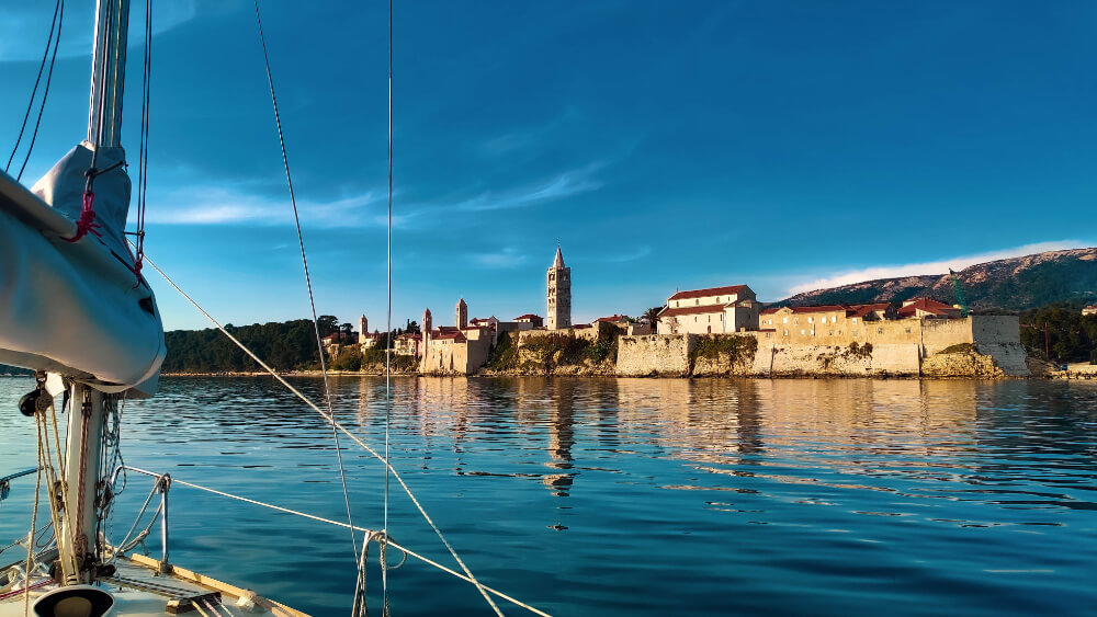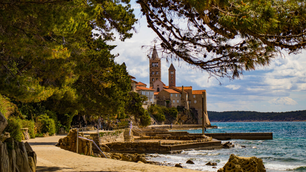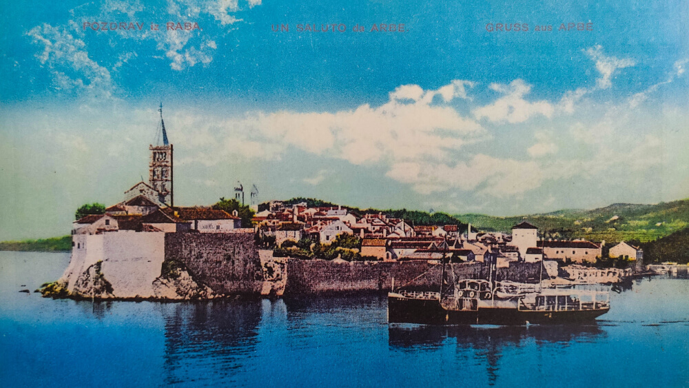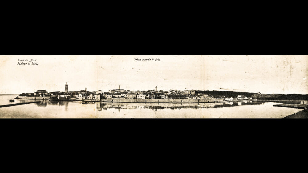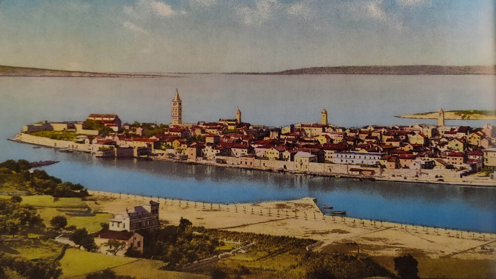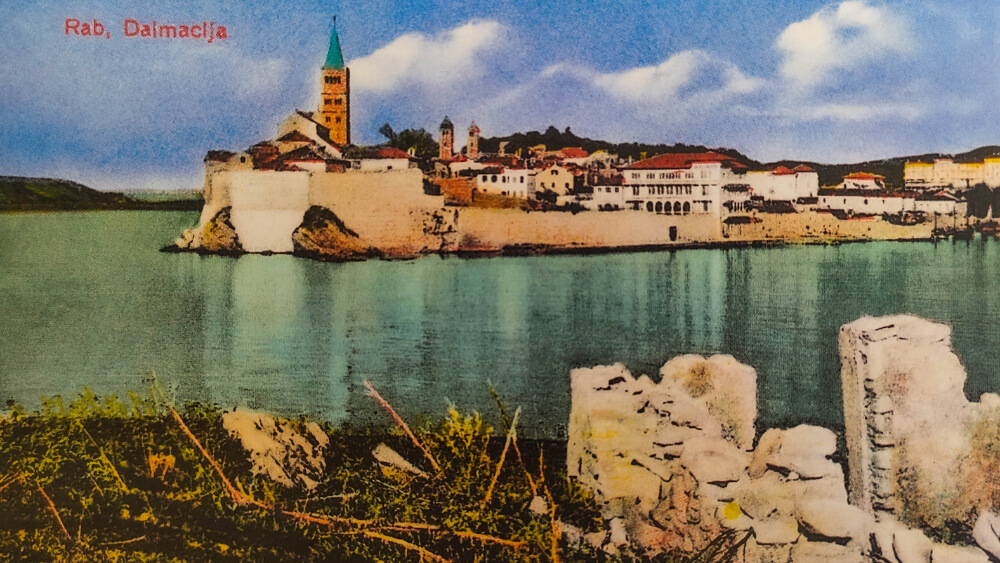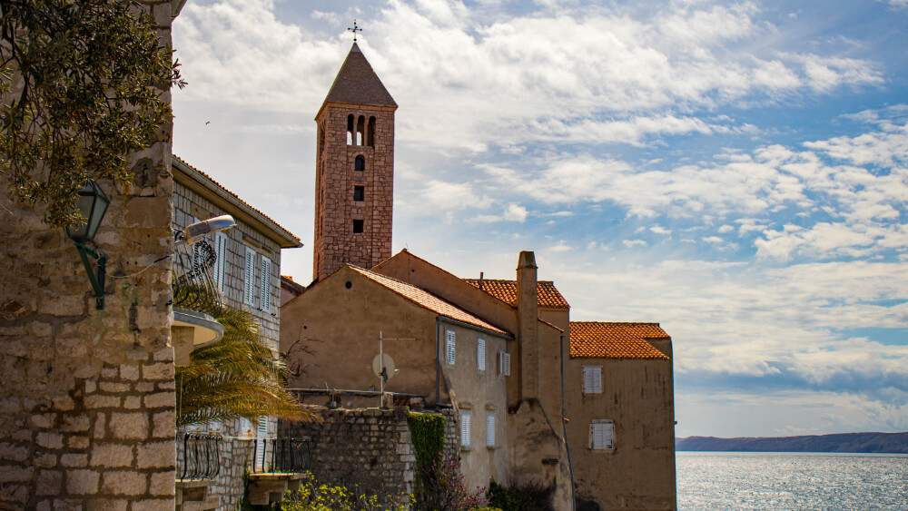 The best-preserved part of the walls is located on the side facing the mainland, where two towers and the lower town gates were demolished at the beginning of the 20th c. At the foot of the Tower of St. Christopher (Sv. Kristofor), there is the Gagliarda tower (Cro. Kula smjelih), which is connected with a hard brickwork (cortina) to the doorpost in the middle. The town is faithfully depicted, almost with a geodetic precision, in the picture from the beginning of the 17th c. kept at the Sacral Art Museum at the Church of St. Justine. Only the three Romanesque-style bell towers are in the picture, because the fourth one, the one of St. Justine, was built only in 1672 in a simple Baroque-style form. With the building of the bell tower, the view of Rab with its four bell towers for which it is well-known worldwide has been completed.