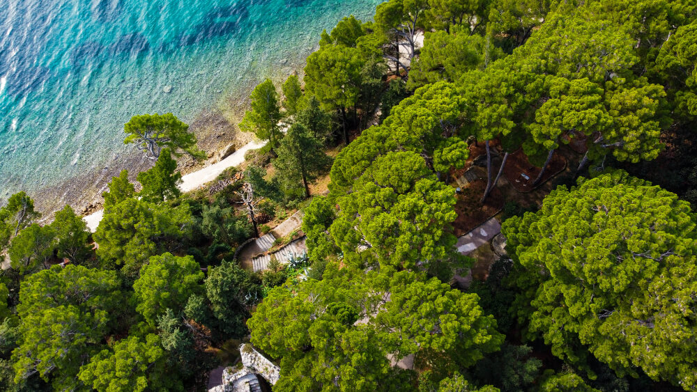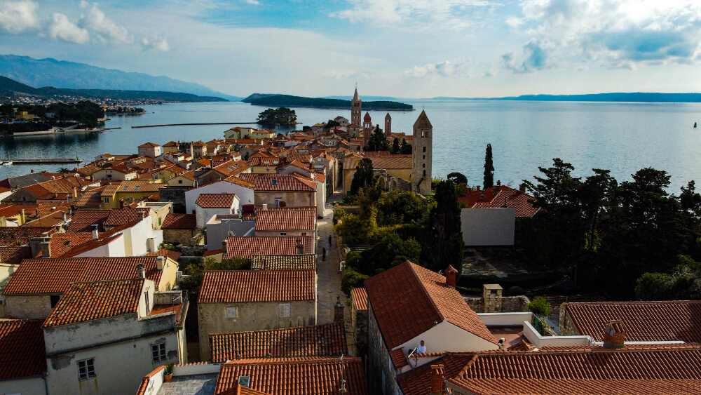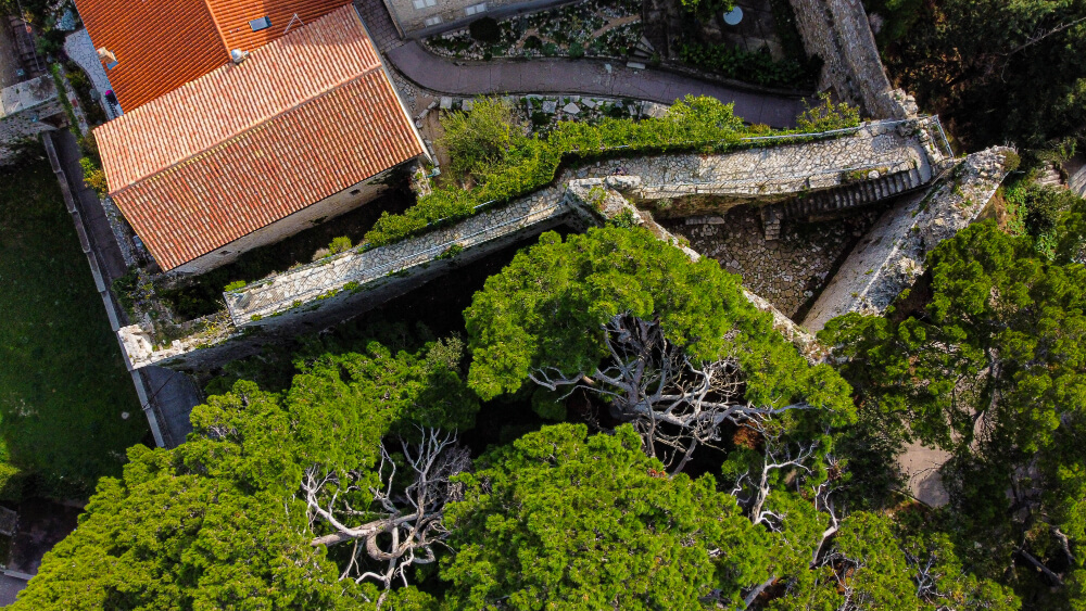 The city walls are open on the side facing the sea and are used to reach the middle of the town park with the bust of Pravdoje Belija, the head forester from Rab who created such a masterpiece.