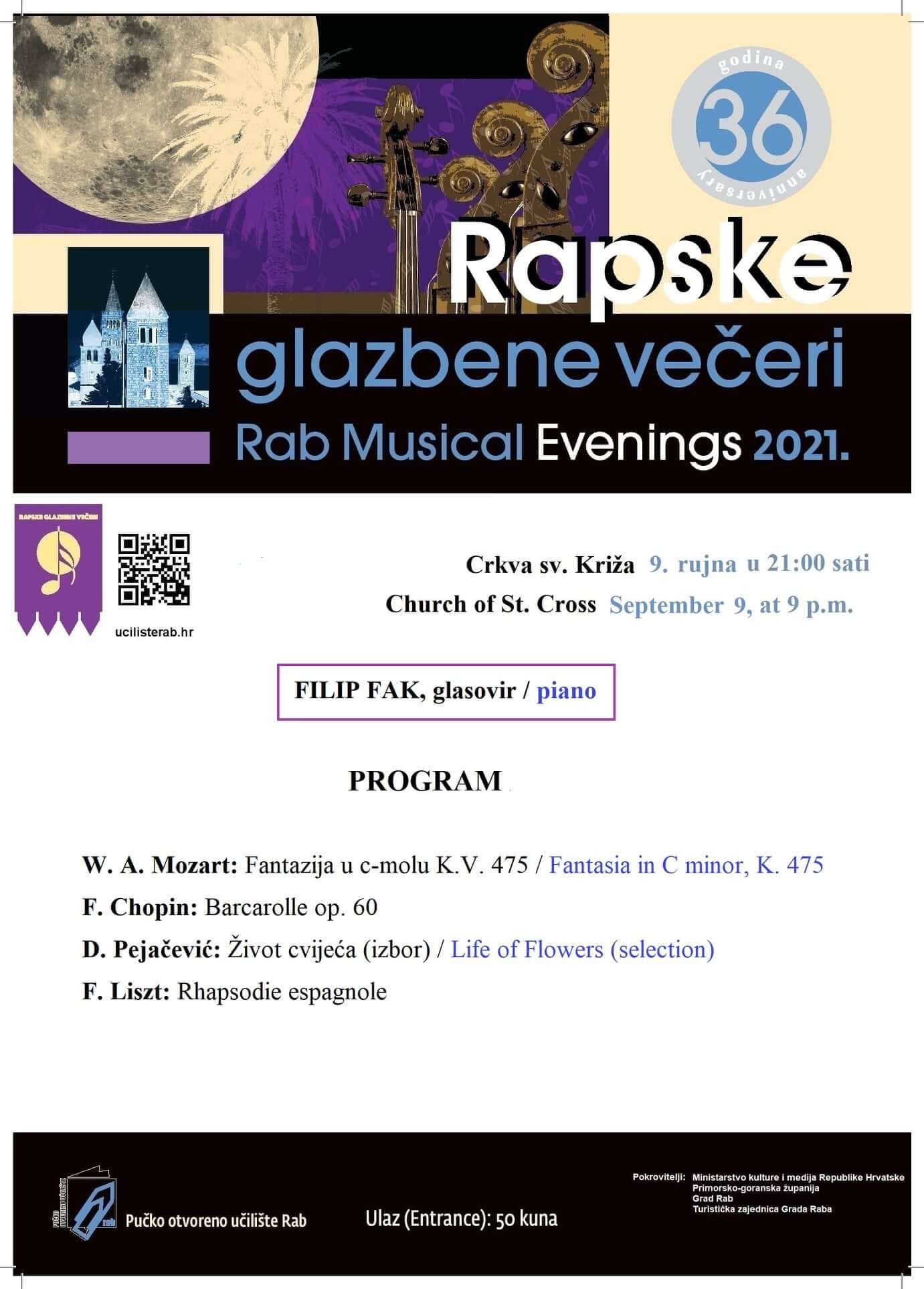 U organizaciji Pučkog otvorenog učilišta Rab i pod pokroviteljstvom Ministarstva kulture i medija RH, Primorsko-goranske županije, Grada Raba i Turističke zajednice Grada Raba, 9. rujna, u okviru programa Rapskih glazbenih večeri koncert će u Crkvi sv. Križa u 21:00 sati održati Filip Fak.