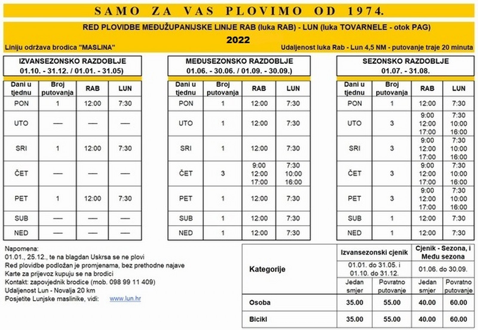 Liniju održava brodica Maslina kapaciteta 12 putnika i 7 bicikala. Udaljenost između luka Rab i Lun (Tovarnele) iznosi 4,5 Nm koju brodica prijeđe za 20 minuta.