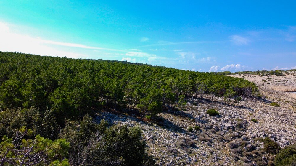 In the 1990s, it was afforested using the Aleppo and Coastal pine, as well as the stone pine. Today, low vegetation covers the southwestern part of the Peninsula along the coastline and the lush pine forest provides a natural screen from the gusts of the cold and strong Bora wind blowing from the direction of Senj.